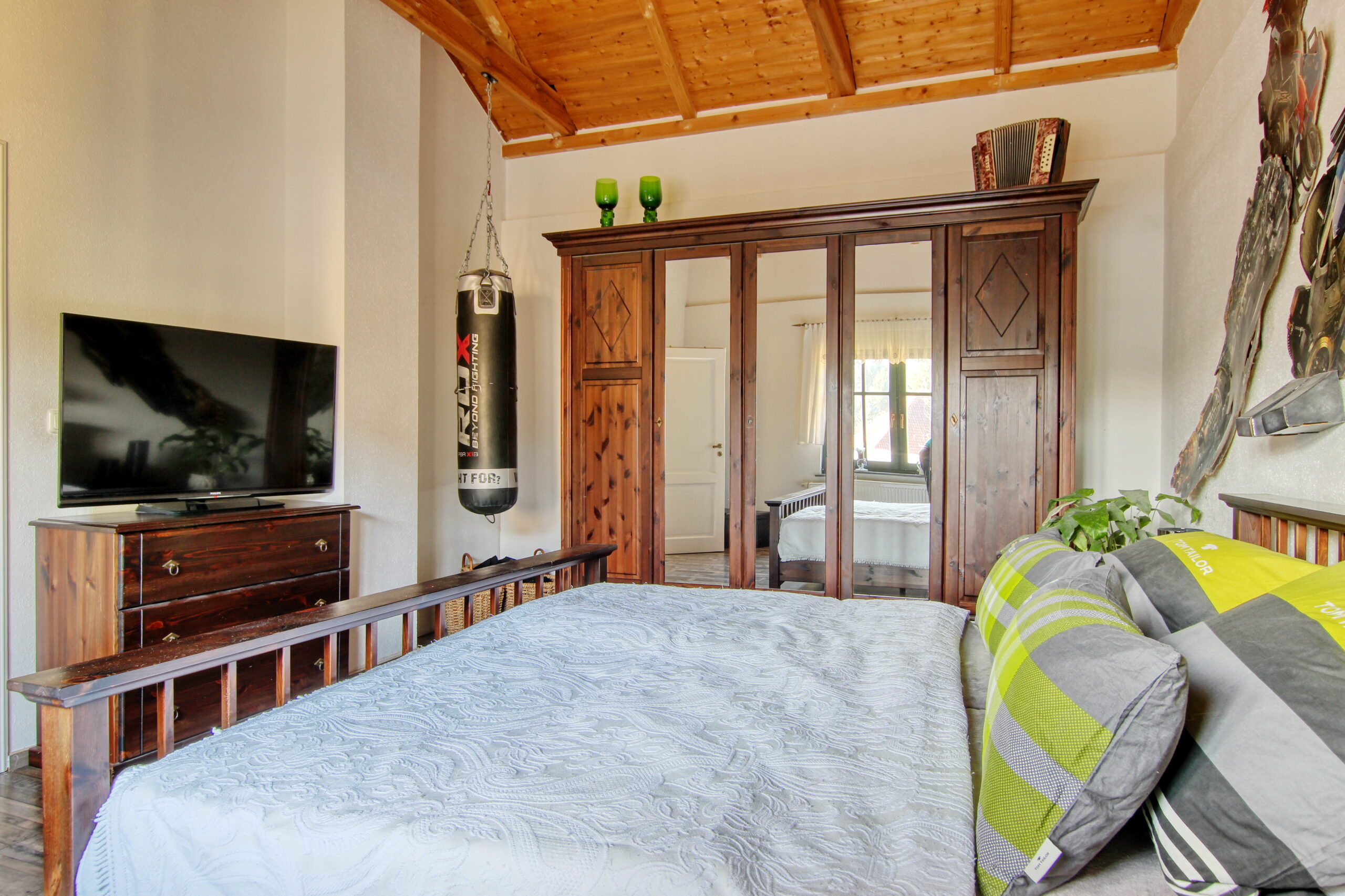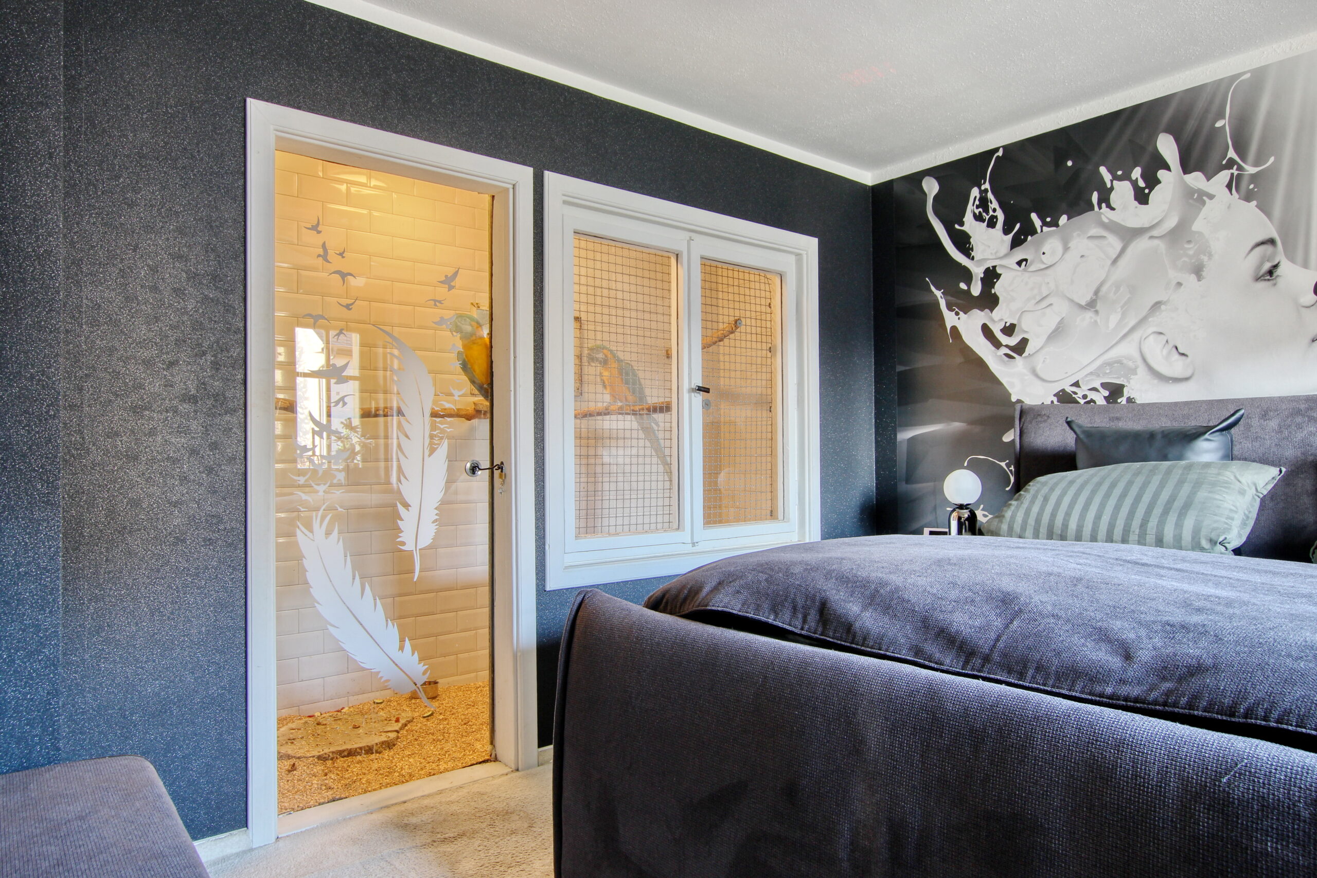 Ein ganz besonderes Highlight des Erdgeschosses befindet sich im Schlafzimmer: Eine großflächige Glasfront eröffnet den Blick auf die seltenen Aras der Familie. Dieses außergewöhnliche Detail verleiht dem Haus eine echte Einzigartigkeit und wird Tierliebhaber besonders begeistern.