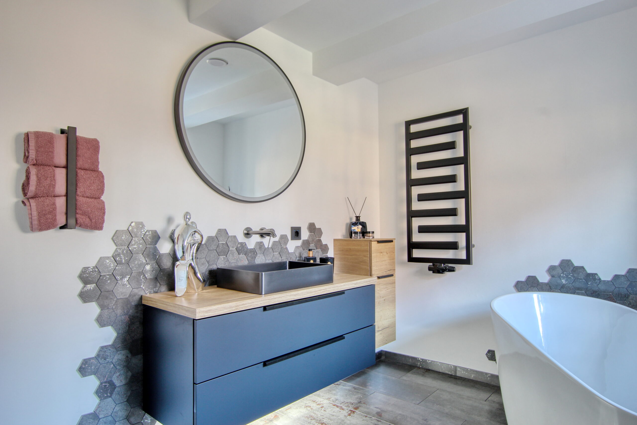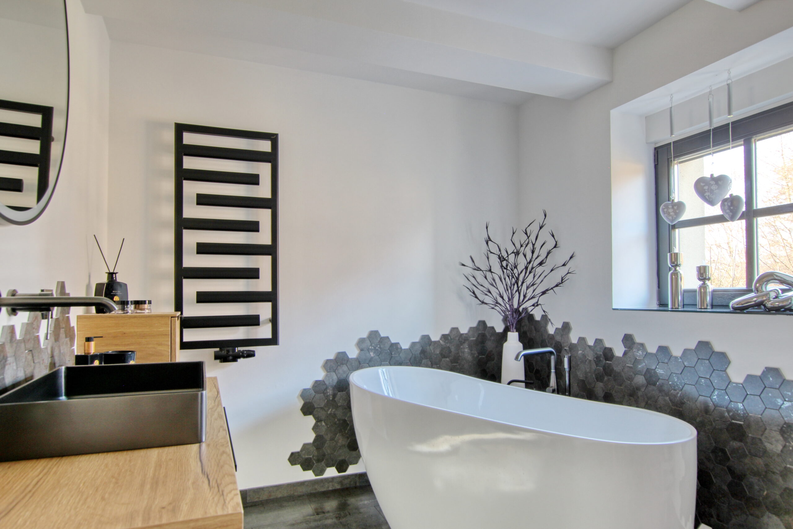 Angrenzend an den Wohnbereich befindet sich das im Jahr 2025 vollständig und hochwertig modernisierte Badezimmer. Dieses überzeugt mit einer freistehenden Badewanne, WC sowie einem stilvollen Waschtisch und fügt sich perfekt in das moderne Wohnkonzept ein.