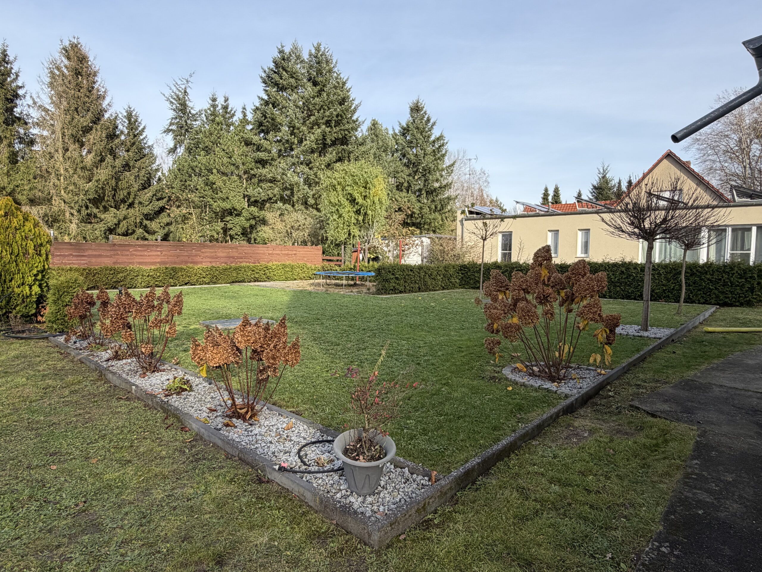 Im Außenbereich erwartet Sie ein gepflegter, liebevoll angelegter Garten, der genügend Platz zum Entspannen, Spielen und gemeinsamen Zeitverbringen bietet. Die ebene Bodenbeschaffenheit eröffnet vielfältige Nutzungsmöglichkeiten – vom Trampolin bis zur gemütlichen Lounge-Ecke.