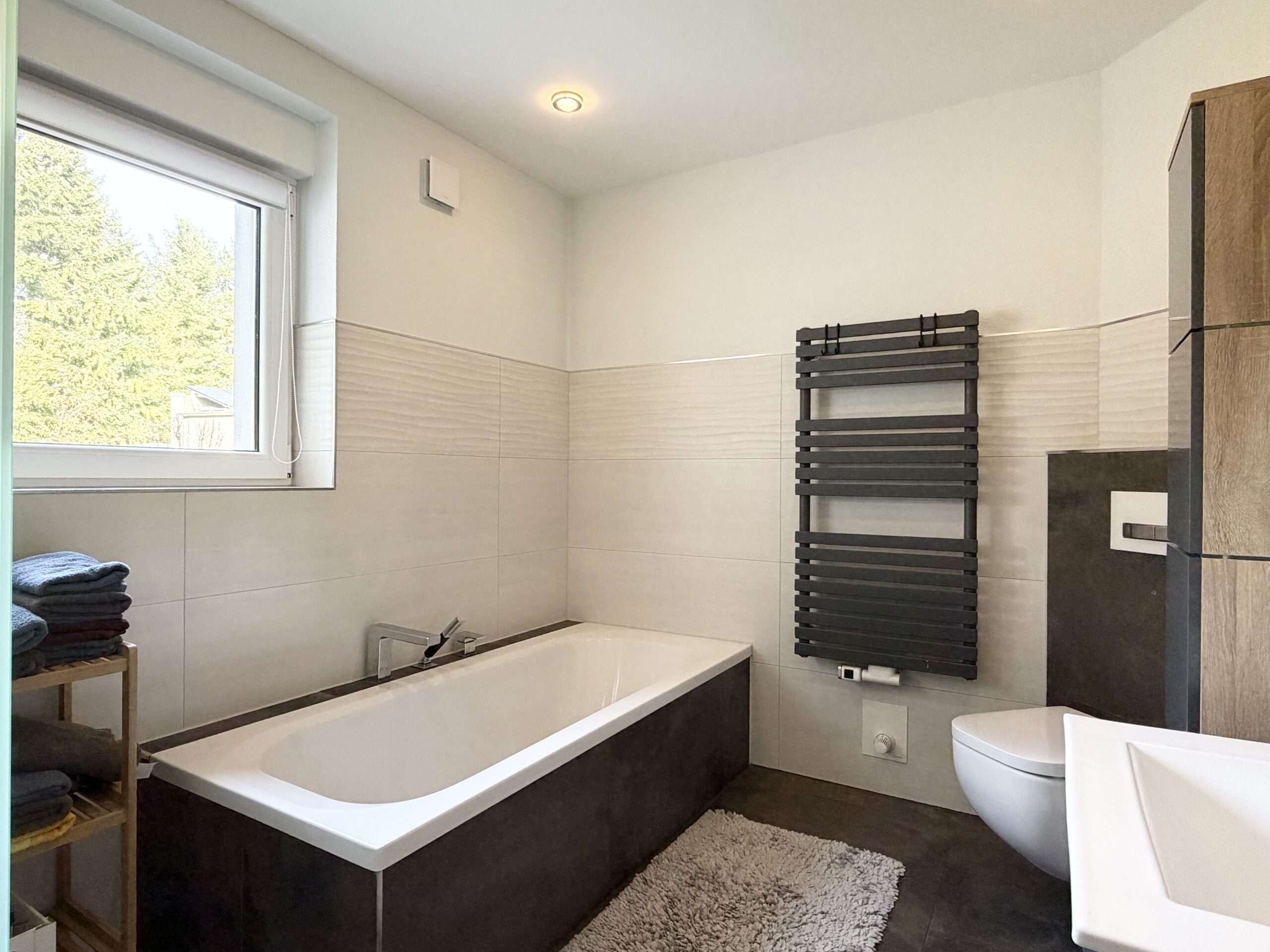 Zur linken Hand gelangen Sie in das komfortable Badezimmer das ebenfalls über eine Fußbodenheizung verfügt. Es überzeugt mit einer ebenerdigen Dusche, Badewanne, WC und einem stilvollen Waschtisch – perfekt für den Familienalltag.